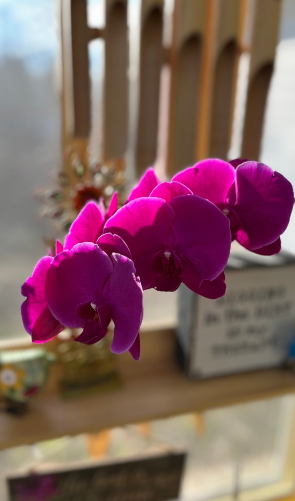 My sunroom was aglow in the late afternoon sun today. The plants were loving it. I have three orchids currently blooming. I sent pictures of them to my friend.