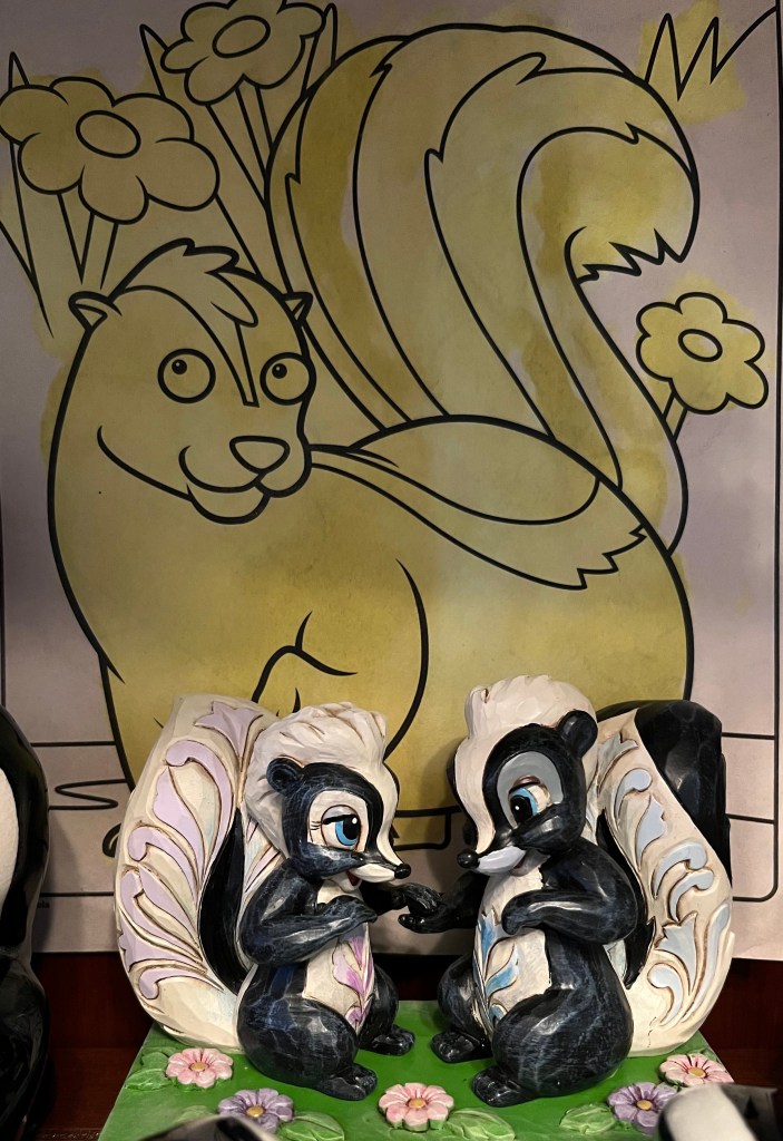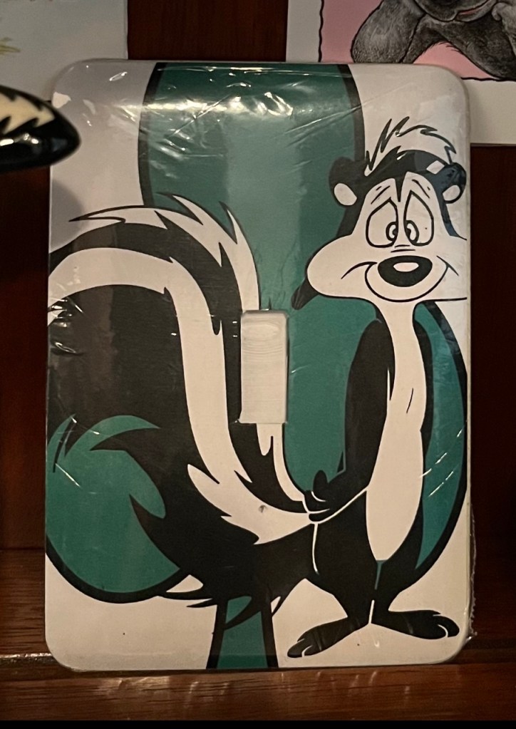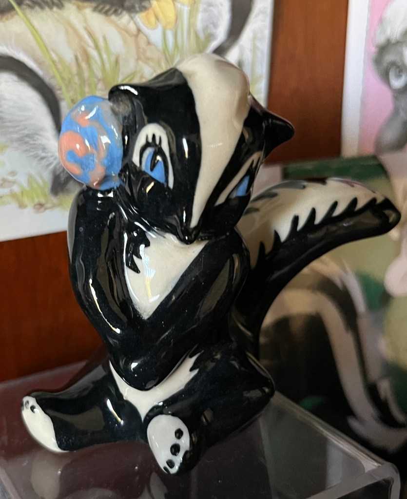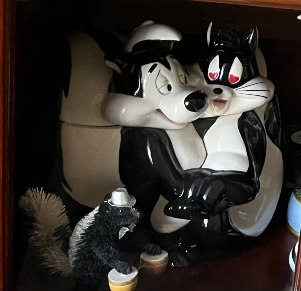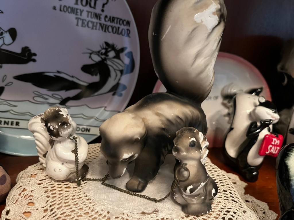 I collect skunks. It’s a lot of fun actually, because skunks are a challenge to find. I have found an array of antique skunks. Salt and pepper shakers, an ashtray, pins, and figurines. I have several Pepe Le Pew Christmas ornaments, salt and peppers, and a cookie jar. I even have a light switch cover. But let’s not forget Flower from Bambi. My collection also includes greeting cards, a butter dish, dice, key rings, plates, and a glass.