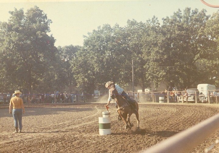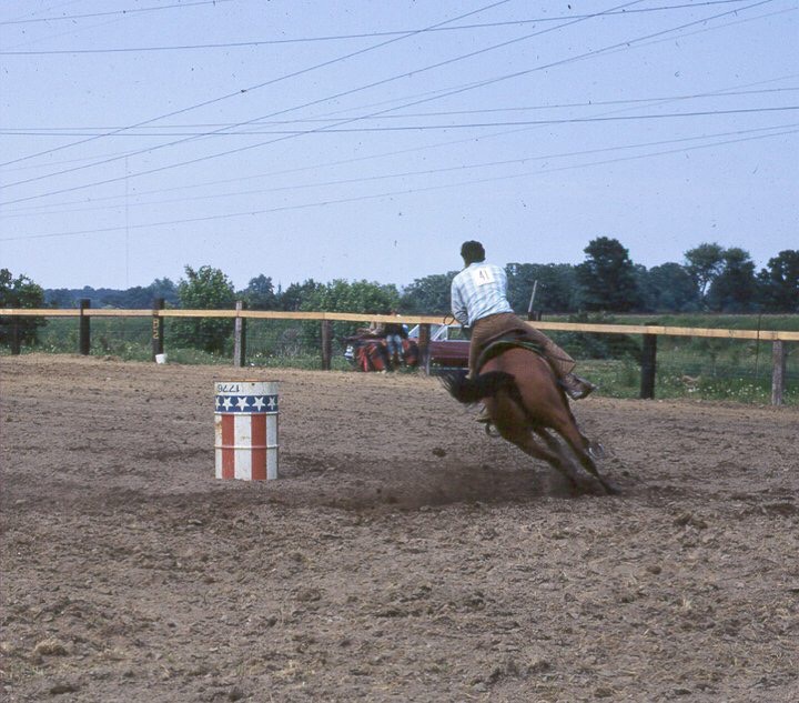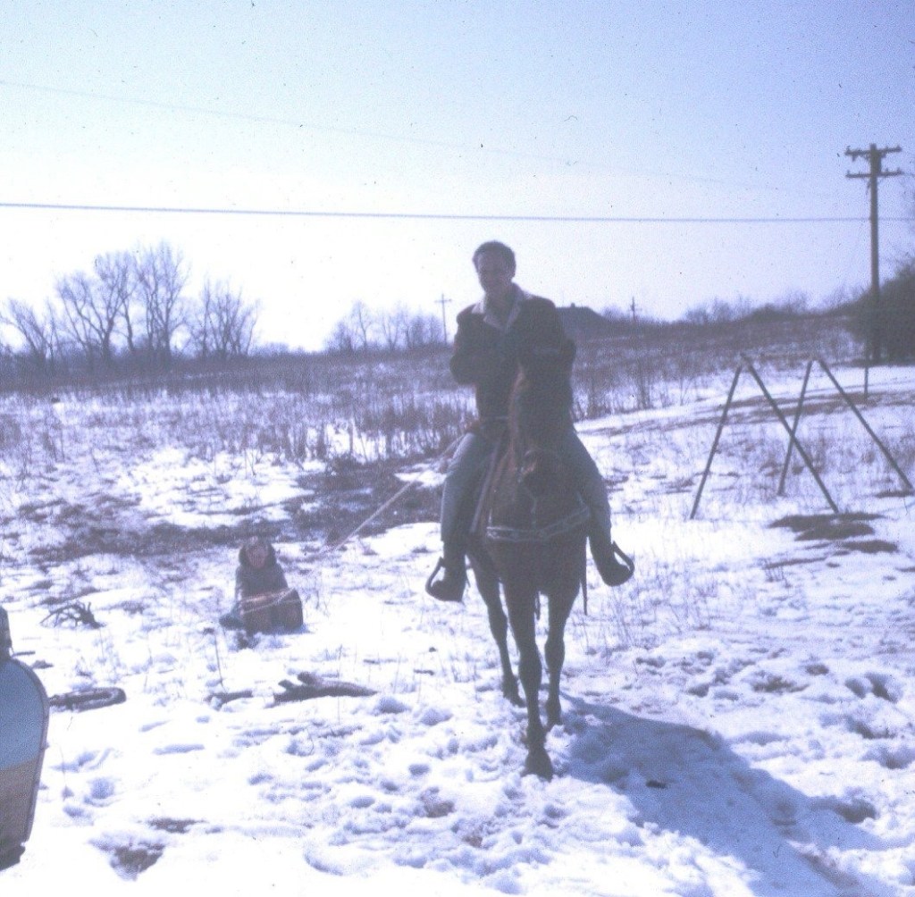 Then he decided to get a horse. Buck was a quarter horse with an attitude. With some help, he broke Buck and was finally able to race him at horse shows. Dad and Buck ran the barrels, flags, and poles. They became quite a team. They even took us kids on toboggan rides in the winter.