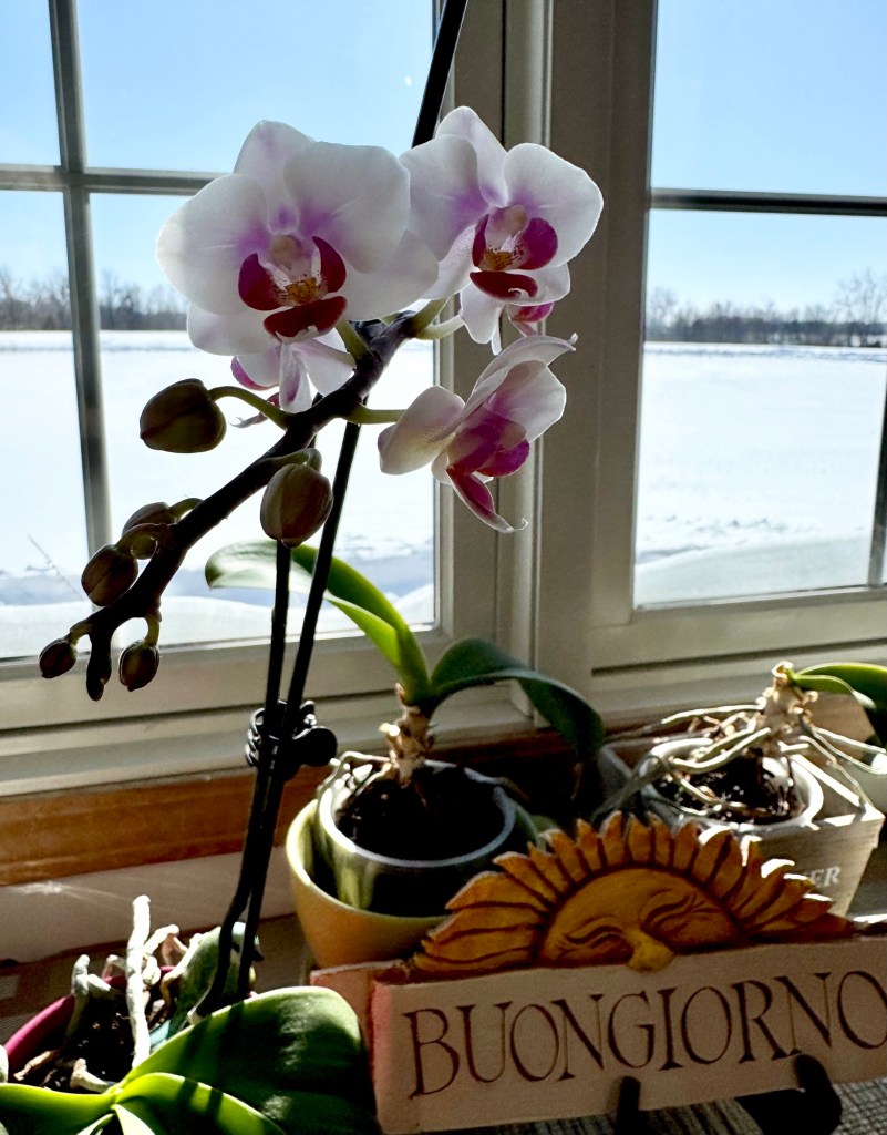 Meanwhile, I keep piling on more clothes or wrapping up in blankets. Periodically, I find myself standing in the bright sunlight of my kitchen window and dreaming of the back patio in summertime. The sun feels so good on my face. My orchids are loving it too.