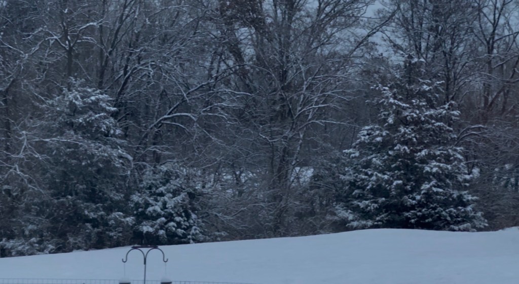 The next morning beheld a most beautiful outdoor scene. And the most amazing thing about it was the fact that no color was to be seen anywhere…except for an occasional cardinal at the feeder or sitting on a snowy branch in the big cedar tree. Everything was black and white. Even the sky was a heavy grey. It could have been a scene from a 1940’s movie. A scene perfect for It’s a Wonderful Life. A perfect scene for me.