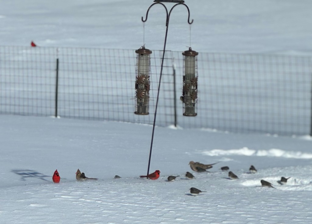 Birds are flying from the fence posts to the feeders to their homes in the cedar trees or holly bushes and then back to the fence again. But this activity has to be admired from my window today.